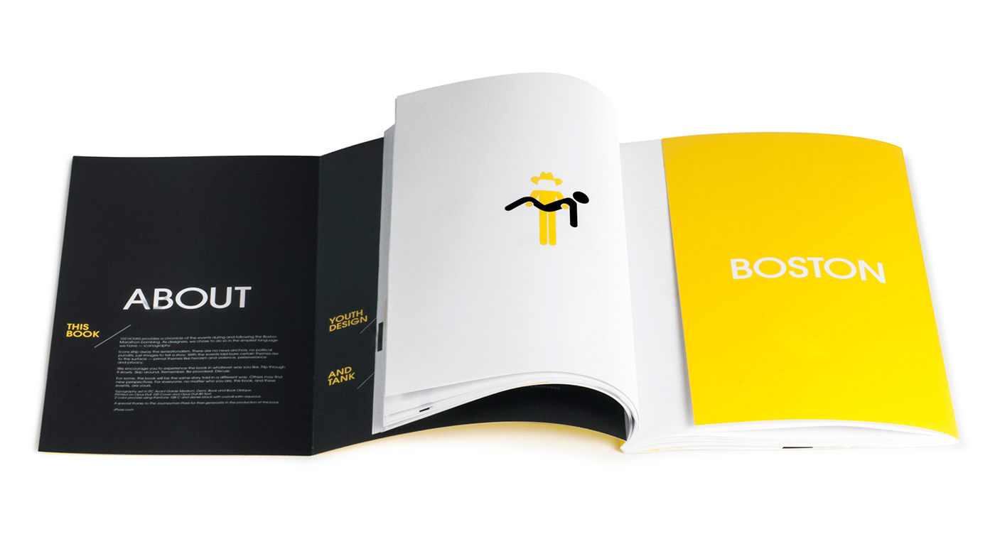 In an effort to make sense of the violence the city of Boston and surrounding communities experienced in April 2013, Tank Design created a book using the simplest human language we have: iconography. “102 HOURS,” released on the eve of the Boston Marathon bombing’s first anniversary, represents the events during and following that day. An austere and linear account of a previously inconceivable five days, the book encourages private reflection. The idea for the project was born in the days following the manhunt, a time that was at once tragic, mesmerizing and confusing. We wanted to create something that would succinctly tell the story in remembrance, something everyone could identify with. Designers pride themselves on simplifying expression and messaging to its very core, so we wanted it to be as simple as possible. Initial research on the history of visual story telling brought us to the wordless woodcut novels by Frans Masereel, and the recent pioneering narrative by Stephen McCarthy, which used pictograms to document England’s riots of 2011. For style we found inspiration in the work of Stephen McCarthy, Ryan McGuiness, Henry Dreyfuss, and especially Otl Aicher’s 1972 Olympic pictograms. All proceeds benefit Youth Design, a Boston-based youth mentoring organization. Tank's been very involved with Youth Design for the past few years, and 102 HOURS was a project our summer intern helped out on. It was the perfect project for a young designer to be a part of. The icons started as simple shapes, built from circles and squares. As our intern’s skill set grew, we added complexity to the graphical language. There’s a lot of great marathon related charities out there, but this project is more about solving the problem from the root of the cause, to respond by building a stronger community. When the age of the two suspects was released, it struck me how important it is to provide mentors for our kids. Every time there’s an internal attack like the one last year, it happens because people feel rejected, like their community doesn’t care about them and isn’t helping them. Like they aren’t a part of it. We believe the problem can be solved from its roots, at the community level, to help prevent something like last April from happening. There are plenty of ways to do that, but as designers, writers and marketers, we have the most impact by using our communication skills and by mentoring others.