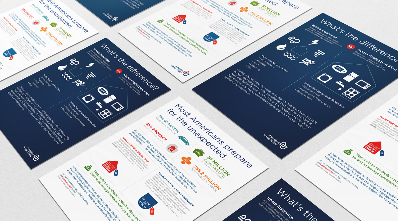 American Home Shield is the leading provider of home warranties in the country — but they still run into a knowledge gap when making sales. People don’t know what a home warranty is, confuse it with home insurance, or don’t see the value in it all together. As a self initiated project by my agency, Tank Design, we decided to try and solve this problem with a few infographic flyers. We wanted to explain what the product was, what it wasn’t, and illustrate the value with simple friendly copy and compelling visuals. The client liked the first draft so much that they wanted to blow out the concept into full videos, posters and shareable social media images.